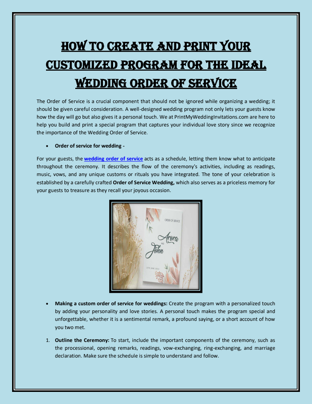 When you print wedding invitations and other materials, ensure they all have the same design theme. Printer wedding invitations and service orders should come from the same printer so your event looks uniform. Sites like Print My Wedding Invitations have templates that make the process easy.
